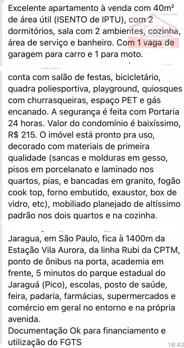 Excelente apartamento a venda no Condomínio Residencial das Laranjeiras com 40m² de área útil (ISENTO de IPTU), 2 dormitórios, 1 sala, 1 cozinha, 1 banheiro, 1 área de serviço, vaga de garagem coberta 1 para carro e outra para moto, 5 édiculas. No condomínio contém, Salão de festas, bicicletário, quadra poliesportiva, playground, quiosques com churrasqueiras, espaço PET, e gás encanado.